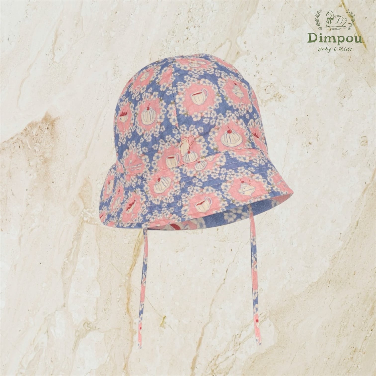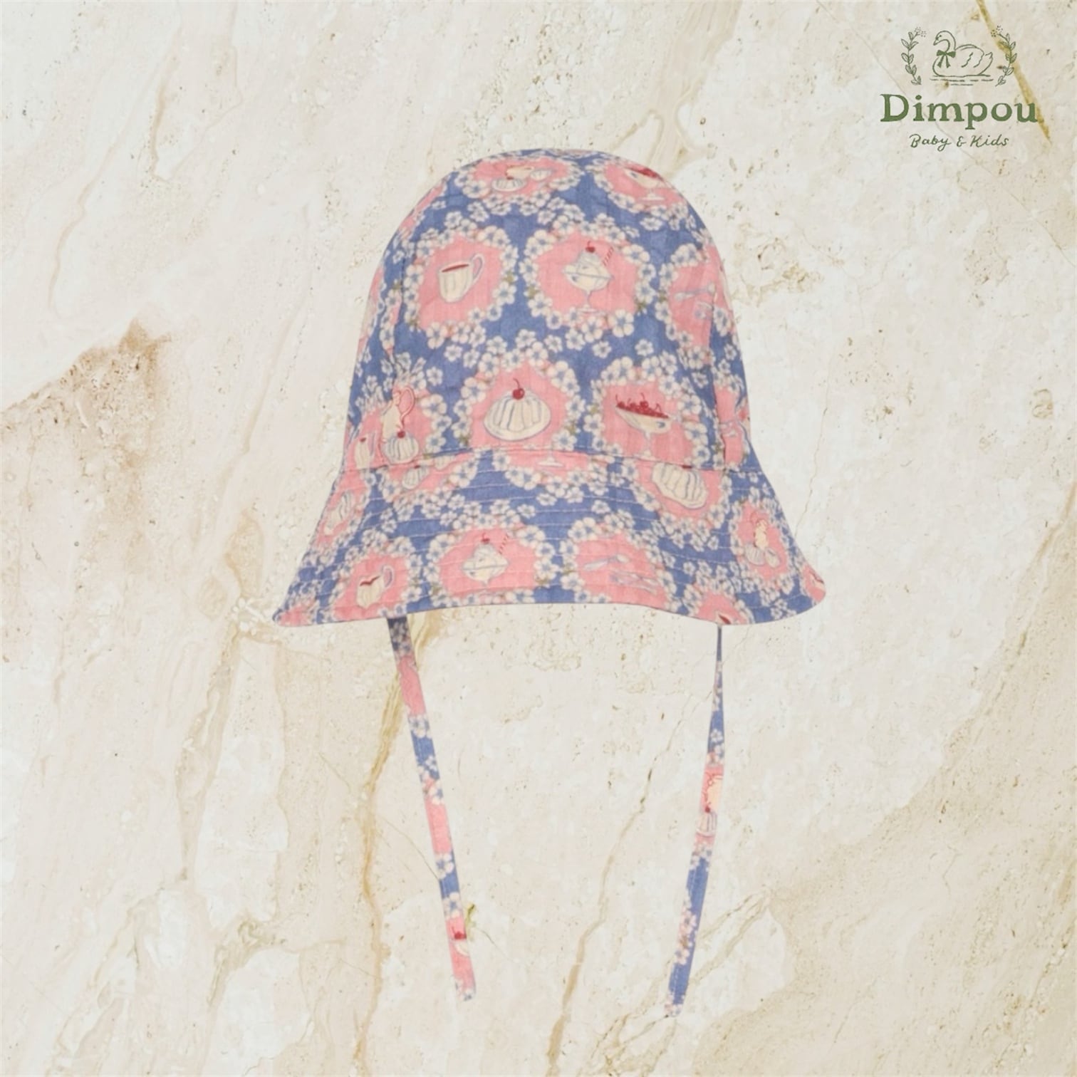 爽やかなブルーの色合いに、ピンクの花、カップ、ケーキの可愛らしいプリントが施されたサンハット。